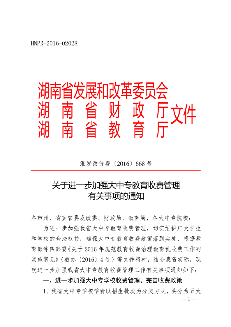 湘发改价费[2016]668号关于进一步加强大中专教育收费管理有关事项的通知