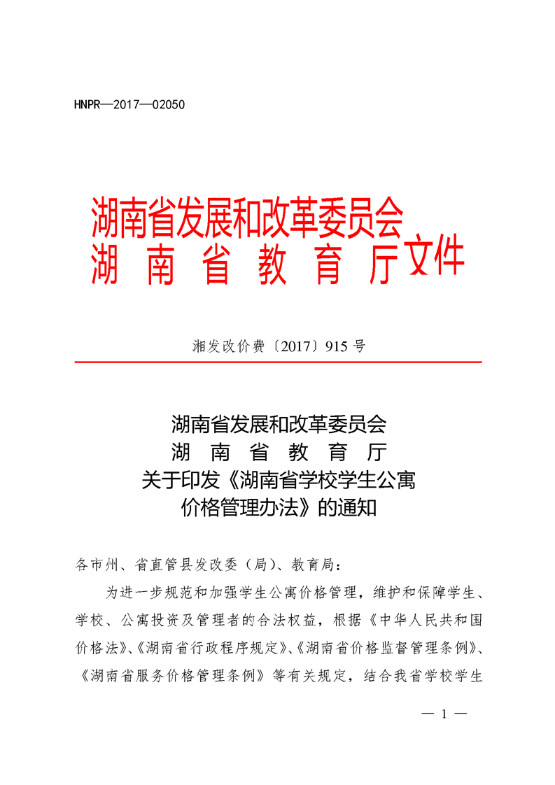 湘发改价费[2017]915号-关于印发《湖南省半岛平台学生公寓价格管理办法》的通知