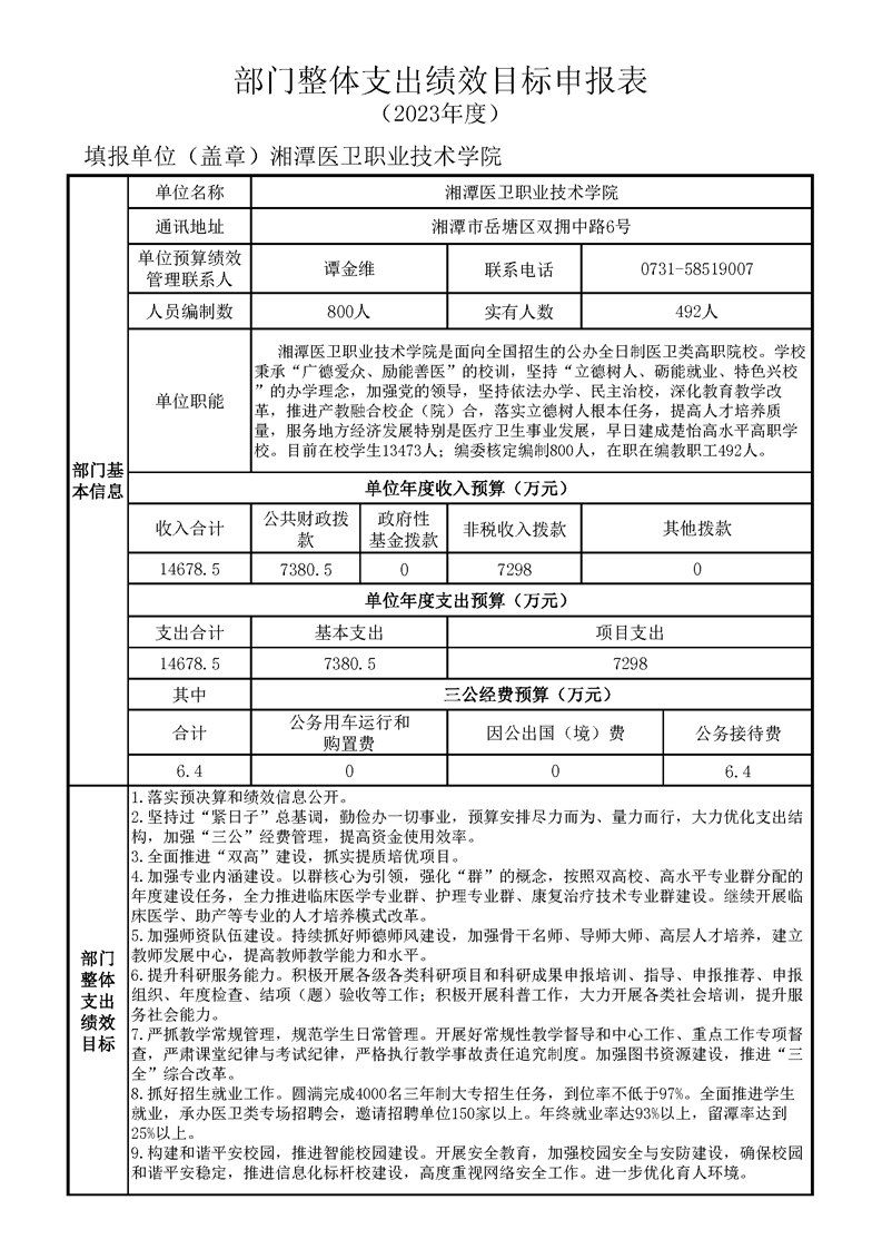 湘潭医卫职院2023年整体支出绩效目标申报表