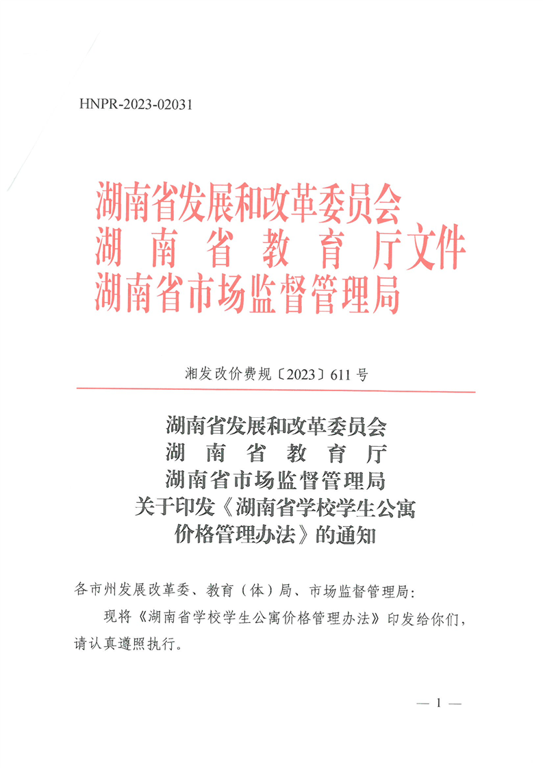 湘发改价费规〔2023〕611号关于印发《湖南省半岛平台学生公寓价格管理办法》的通知