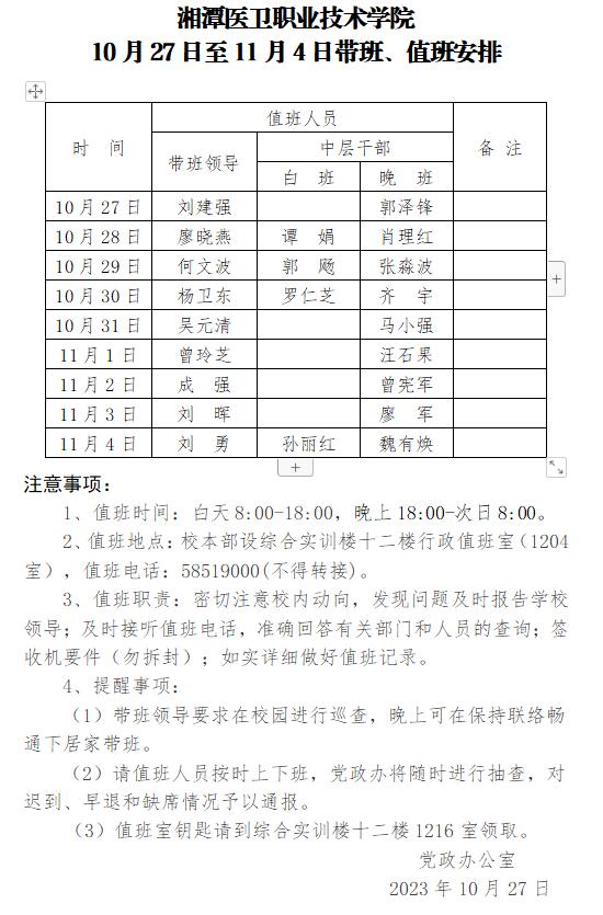关于2023年10月27日至11月4日带班、值班安排的通知