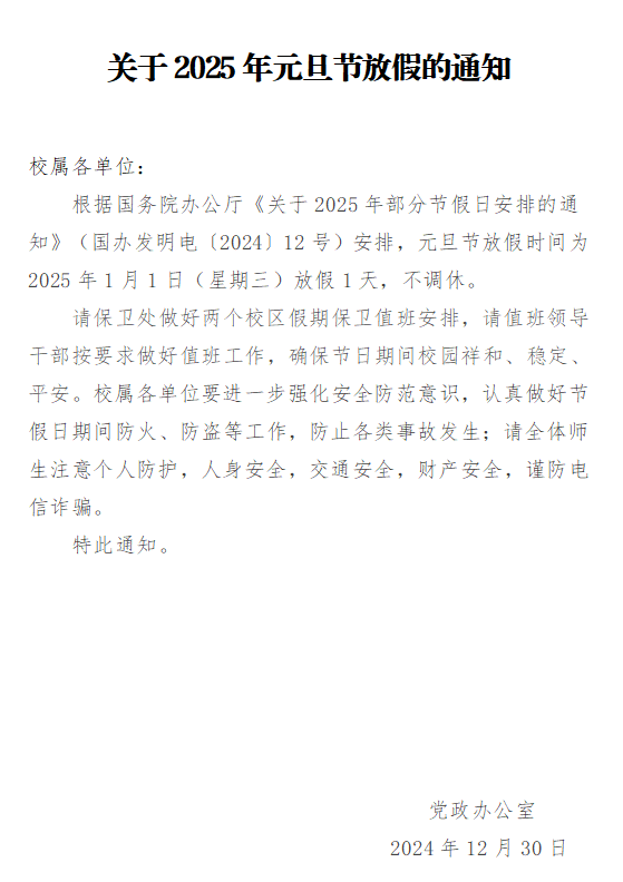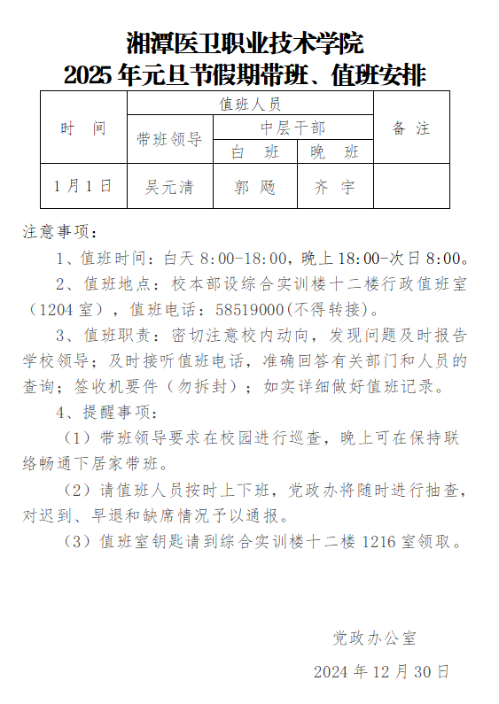 关于2025年元旦节放假带班、值班安排的通知