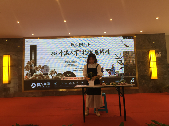 为丰富教职工业余文化生活,激发工作活力和凝聚力,提升教职工欣赏美、创造美的能力,在第三十四个教师节来临之际,校工会联合恒大房产于9月10日下午在恒大书香门第举办了“桃李满天下 礼谢恩师情”创意插花活动。