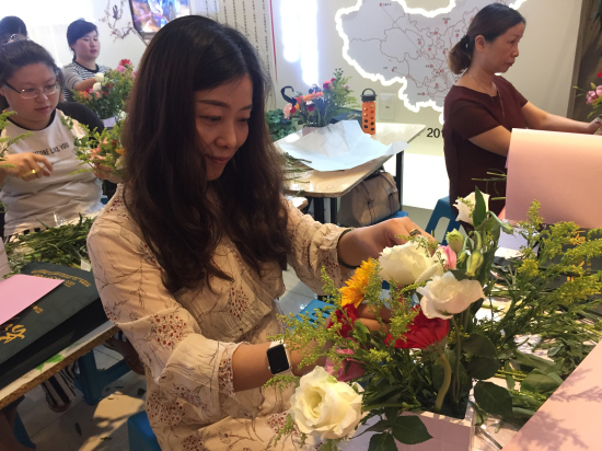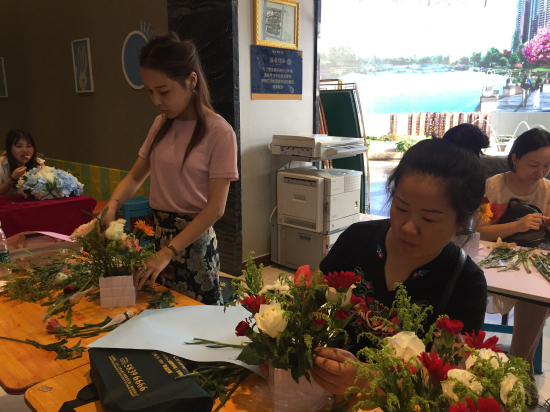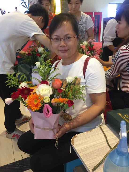 活动开始,花艺师对插花的由来、花器的异同以及如何养花护花进行了讲解,介绍了花材、叶材的修剪处理,插花基本结构和基本造型技法,并为大家示范插花步骤。在花艺师的讲解和指导下,教职工们展现自己的聪明才智,发挥对美的想象和创意,经过一个多小时的亲手实践,一盆盆各具特色的美丽插花作品展现在大家眼前,大家手捧着自己的得意之作,纷纷拍照留影,脸上洋溢着喜悦之情。