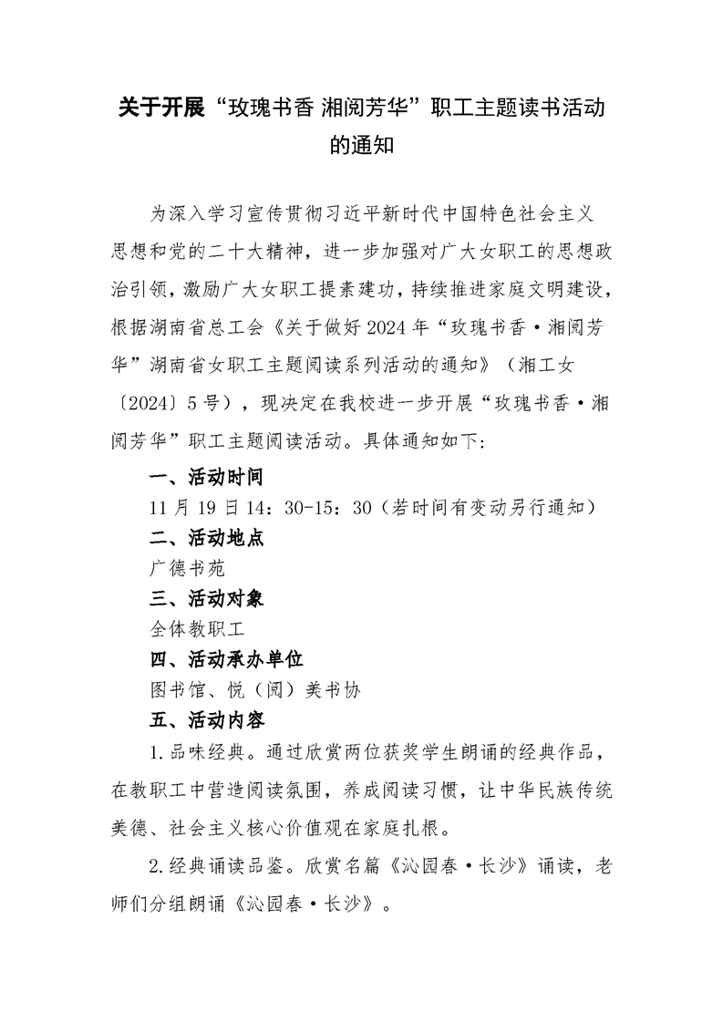关于开展“玫瑰书香 湘阅芳华”职工主题读书活动的通知