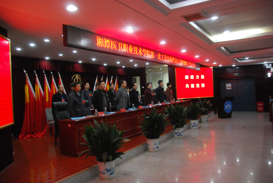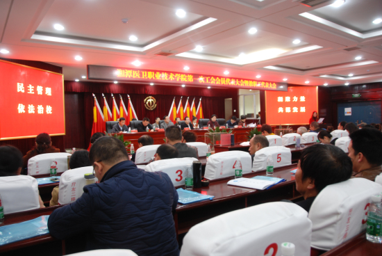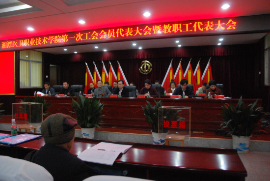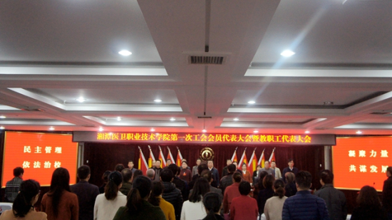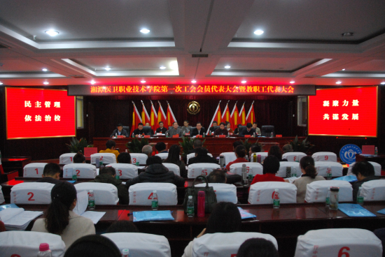 11月26日,湘潭医卫职业技术学院第一次工会会员代表大会暨教职工代表大会在护理楼一楼报告厅隆重召开,参加本次会议的有教职工代表、特邀代表、列席代表共108人,市教育工会主席王大立、校党委书记刘建强、校长廖晓燕等领导出席了会议。