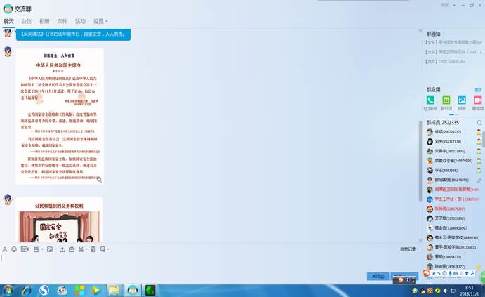 我校在“11.1”《中华人民共和国反间谍法》颁布四周年之际,开展了国家安全教育与宣传。本次充分采取“新老媒体”、“线上线下”相结合,多渠道多形式通过横幅、电子显示屏、校园广播、老师工作交流QQ平台、学生事务微平台开展宣传教育工作。