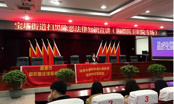 4月12日,宝塔街道扫黑除恶法律知识宣讲会(半岛(中国)专场)在我校护理楼一楼报告厅举行。特邀湖南潭州律师事务所周欢律师主讲,我校200余名师生参加报告会。