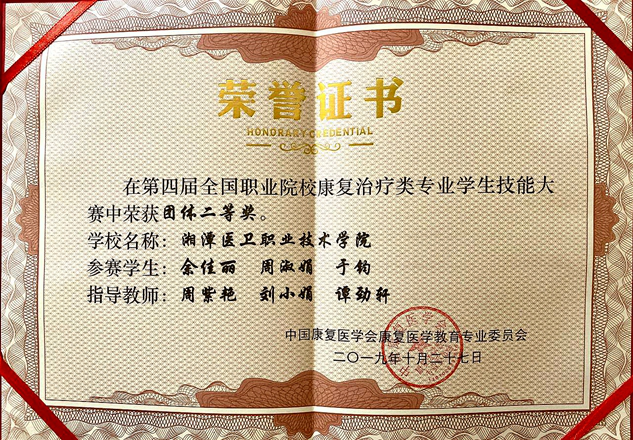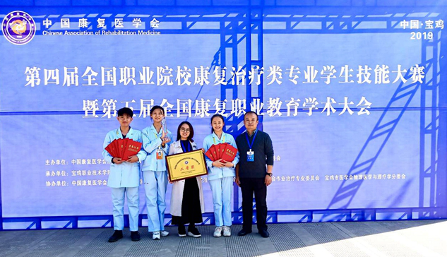 10月25日—27日,中国康复医学会主办的第四届全国职业院校康复治疗类专业学生技能大赛暨第五届全国康复职业教育学术大会在陕西宝鸡职业技术学院举行。由我校医学技术学院康复治疗技术专业学生周淑娟、于均、余佳丽组成的参赛队,经过激烈角逐,荣获团体二等奖,周淑娟同学获得理论单项二等奖,于均同学获得康复治疗单项二等奖,余佳丽同学获得康复问诊单项三等奖。