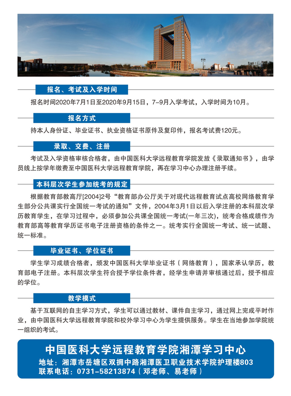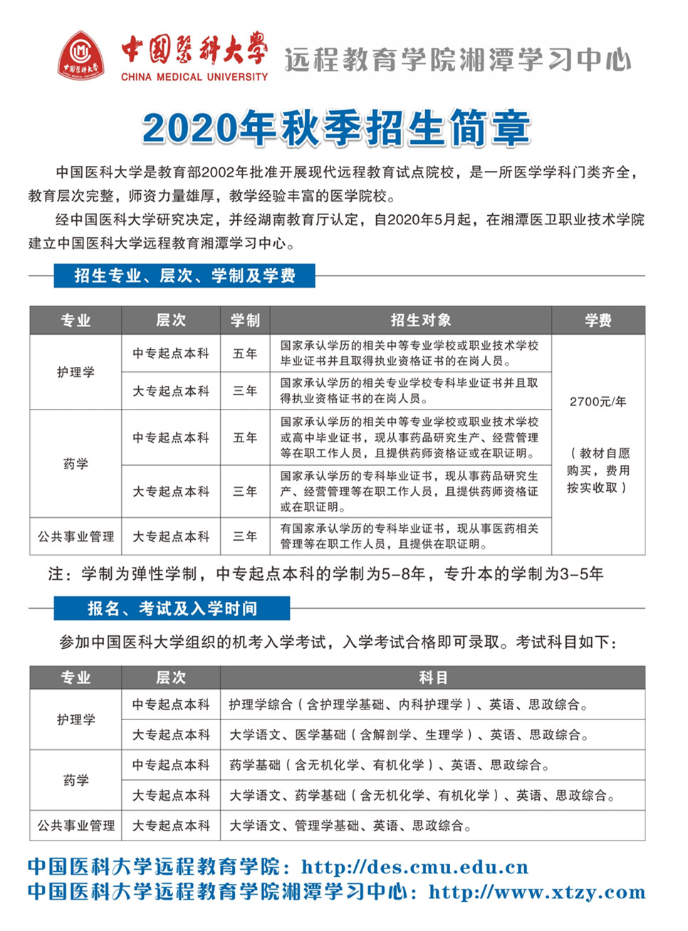 2020年秋季中国医科大学远程教育湘潭学习中心招生简章