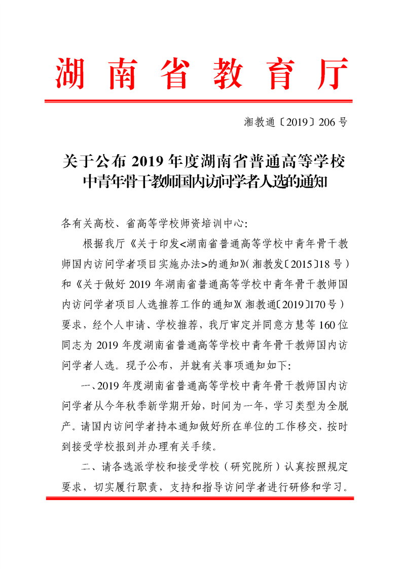 4.3.1.1 关于公布2019年度湖南省普通高等半岛平台中青年骨干教师国内访问学者人选的通知(湘教通