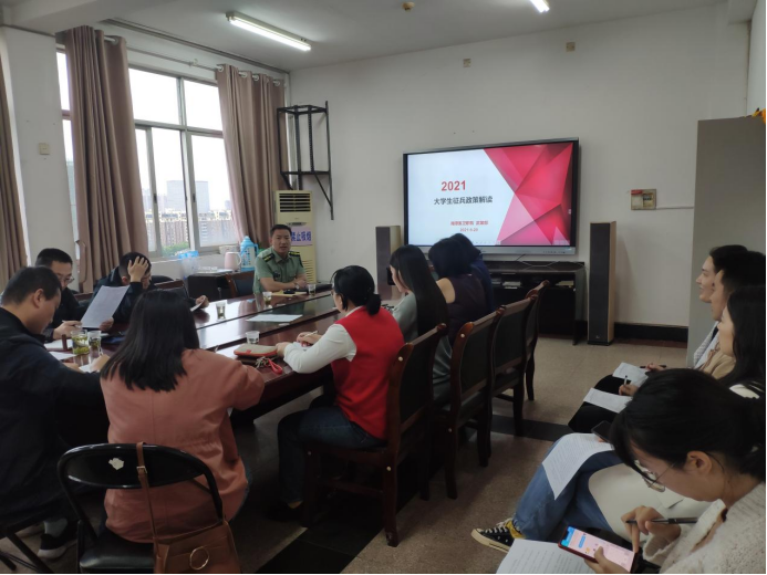 国防教育科长龙亮从“参军入伍的基本条件、大学生入伍流程、入伍大学生优待政策”三个方面对2021年秋季大学生征兵政策进行了讲解,会上大家对征兵工作环节进行了交流讨论。