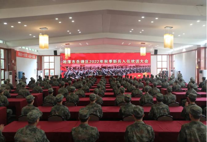 9月15日,湘潭市岳塘区举行2022年秋季新兵入伍欢送大会,140名新兵将陆续开拔,投身绿色军营。现场,区领导共同向入伍新兵赠送水晶纪念品和《新兵心理调适普及绘本》,希望新兵牢记光荣革命传统,争当新时代参军报国好儿郎。