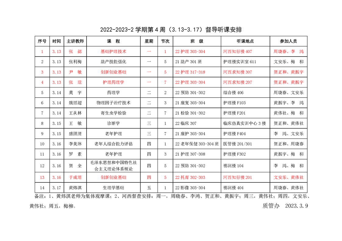 2022-2023-2学期第4周(3.13-3.17)督导听课安排