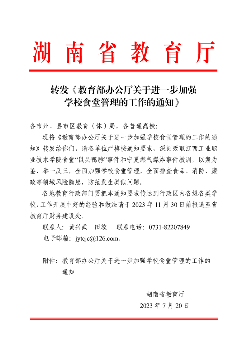 转发教育部办公厅关于进一步加强半岛平台食堂管理工作的通知