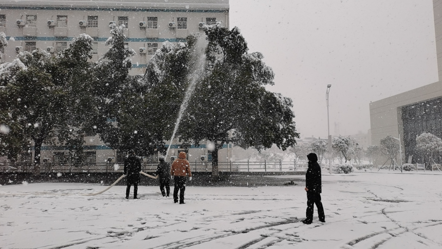 1月22日,2023年的初雪悄悄降临,银装素裹的校园显得格外美丽,但也使得校园路面湿滑、道路难行。为方便师生出行,党委书记刘建强、副校长成强带领基建后勤处同志,对已经结冰的校园进行除冰扫雪,确保校园道路安全畅通。