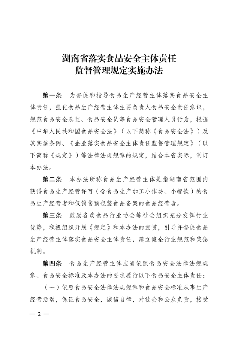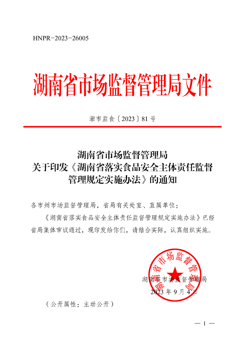 关于印发《湖南省落实食品安全主体责任监督管理规定实施办法》的通知