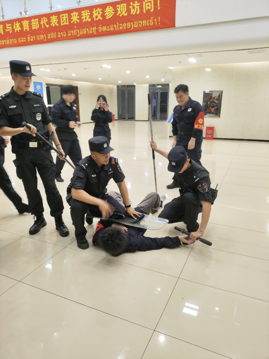 本次培训还邀请到湘潭市公安局巡特警支队红鹰突击队三位教官,对校卫队员进行反恐防暴器材使用、现场处突要点等现场培训。