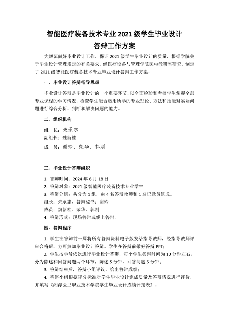 智能医疗装备技术专业2021级学生毕业设计答辩工作方案