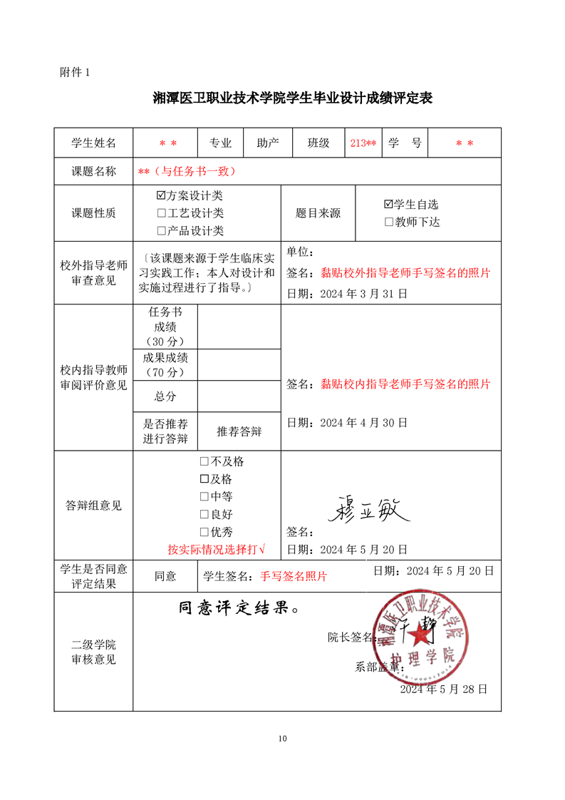 护理学院2024届毕业生毕业设计资料收集、成绩评定登记表