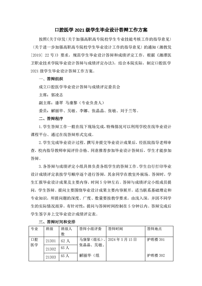 口腔医学技术专业2021级学生毕业设计答辩工作方案