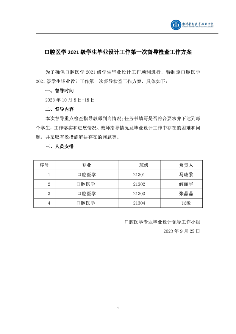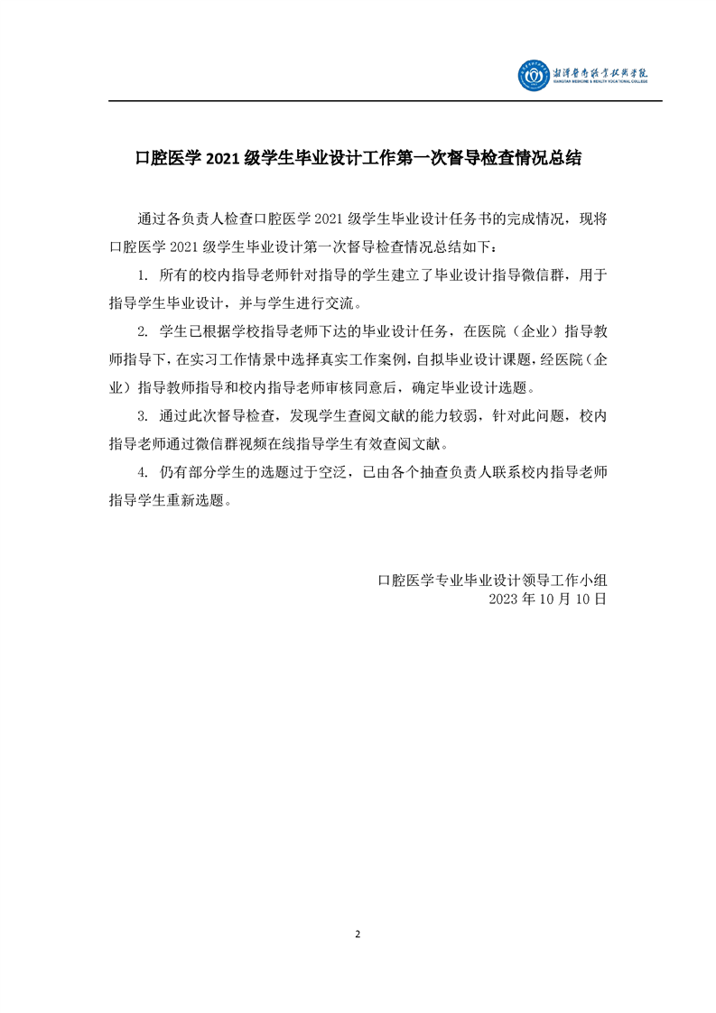 口腔医学2021级学生毕业设计工作督导检查工作方案和督导检查情况总结