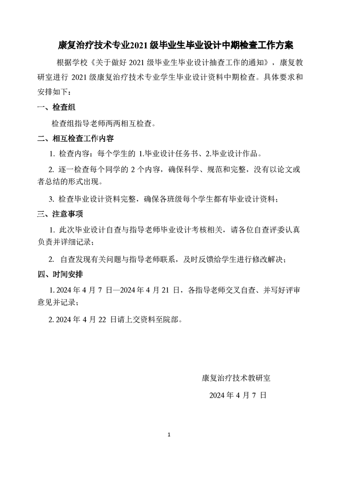 康复治疗技术专业2021级学生毕业设计第1次督导检查工作方案