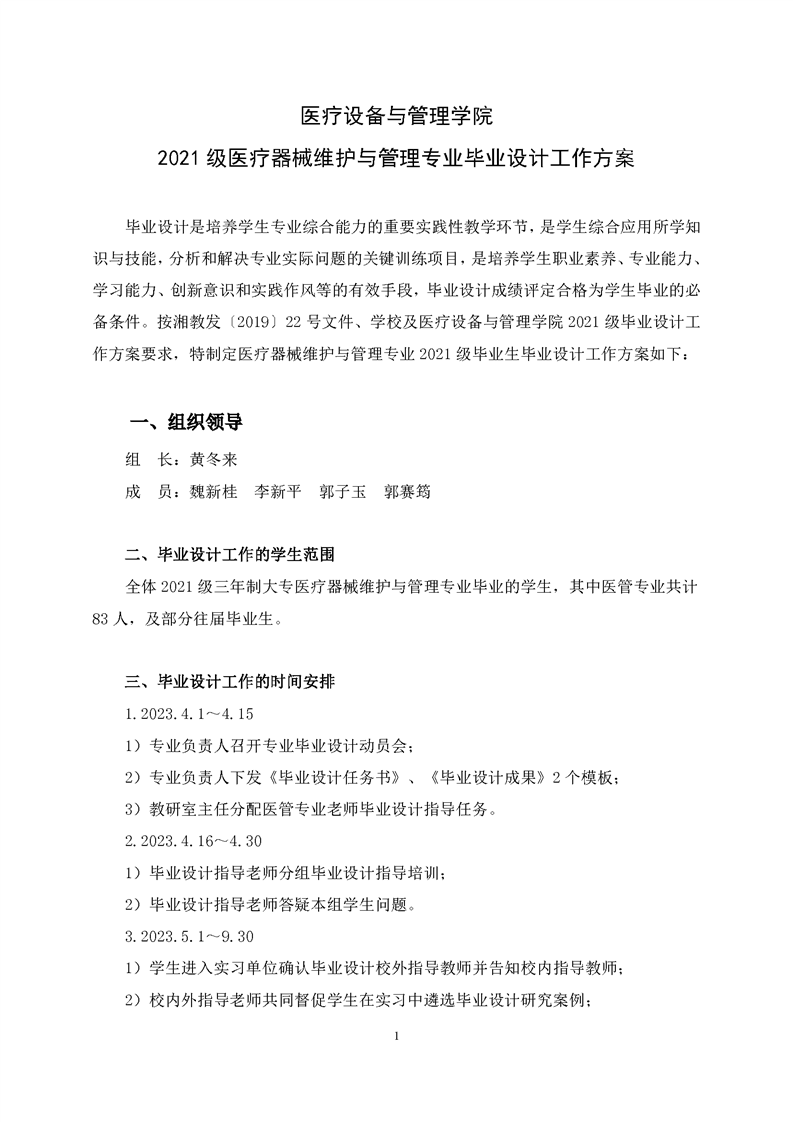医疗器械维护与管理2021级学生毕业设计工作方案