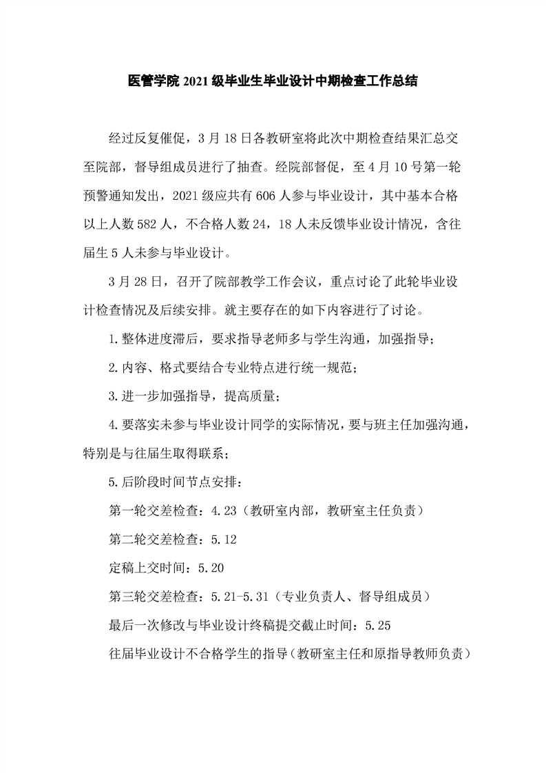 医管学院2021级学生毕业设计工作督导检查工作方案和督导检查情况总结
