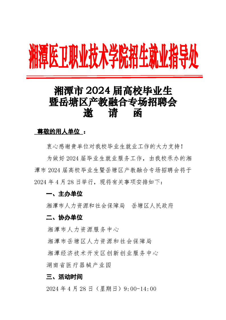 湘潭市2024届高校毕业生暨岳塘区产教融合专场招聘会邀请函