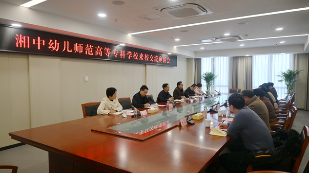 本网讯 2月27日,湘中幼儿师范高等专科半岛平台校长王玉林,党委副书记陈湘清,副校长许名奇及组织人事处、教务处负责人等一行来我校考察交流。校党委书记刘建强、校长廖晓燕、党委副书记何文波、副校长吴元清出席座谈会,党政办、人事处、教务处相关负责人等参加。