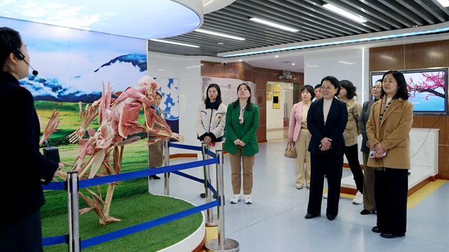 在人体生命科学馆,邱梦丹一行边走边问,不时在展台前驻足观看,通过馆内丰富的实体标本和电子资料,探索人生科学知识,感悟人类生命奥妙。在了解到我校人体生命科学馆已成为湘潭市中小学科学“打卡地标”后,邱梦丹说:“这个科学馆很有教育意义,特别是对中小学生,他们可以很清楚地了解人体生命的奥秘。”