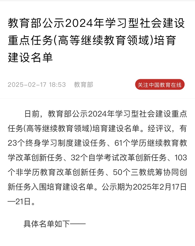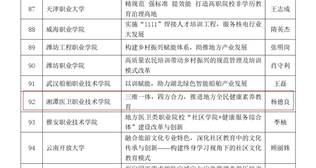 此前,在教育部职业教育与成人教育司公示的2024年申报的学习型社会建设重点任务(高等继续教育领域)培育建设名单中,我校申报的《三维一体,四方合力,推进地方全民健康素养教育》成为全省8个立项建设项目之一。