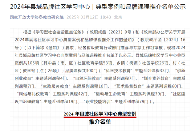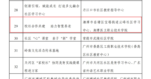 本网讯 近日,教育部职业教育与成人教育司公示了2024年县域品牌社区学习中心推介名单,我校与云峰社区共同打造的《校社合作共建,助力智慧养老》在“县(市、区)社区教育学院典型案例”推介名单之列,是全省唯一一个获教育部推介的社区学院教育典型案例。
