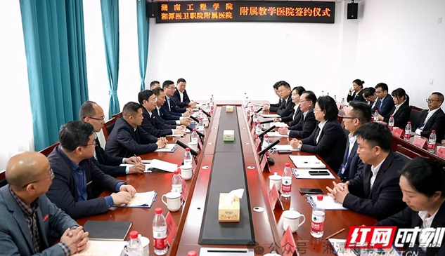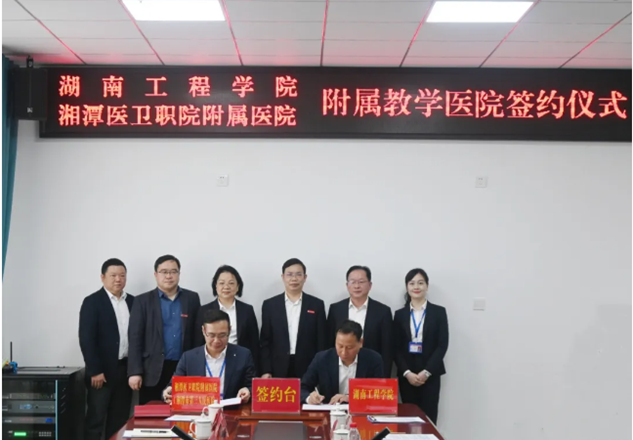 在双方领导的共同见证下,湖南工程学院副校长魏克湘和湘潭医卫职院附属医院院长周晓峰签署合作协议。签约现场掌声热烈,标志着校院合作正式进入实施阶段。