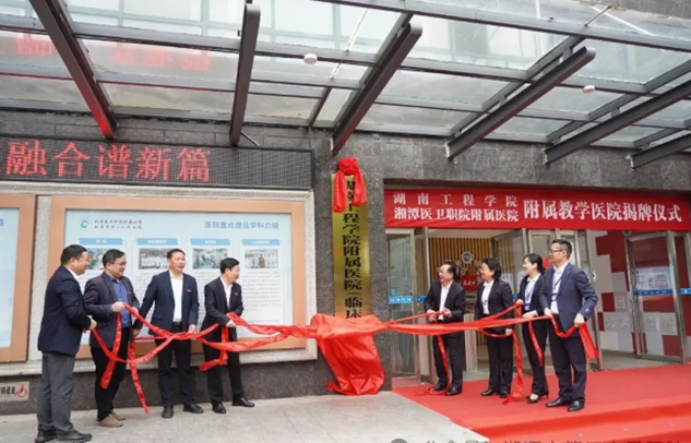 黄昕充分肯定了湘潭医卫职院附属医院的发展态势以及教学医院的经验和优势。他认为,这次具有历史意义的医工融合合作将铭刻进双方的发展史册,也将助推健康卫生事业的发展。这次合作开创湖南之先河,打造医工融合创新共同体;树立教育之标杆,打造医教协同育人共同体;建设服务之高地,打造服务卫生健康共同体。今天的挂牌只是一个开始,未来的美好前景将徐徐而来,双方将共同开展教学、科研等方面的深度融合,共同培养高素质型医工融合复合型人才,探索医学教育新模式,更好地助力“健康中国”“健康湖南”“健康湘潭”战略目标,担负起守卫人民生命健康的责任和使命。