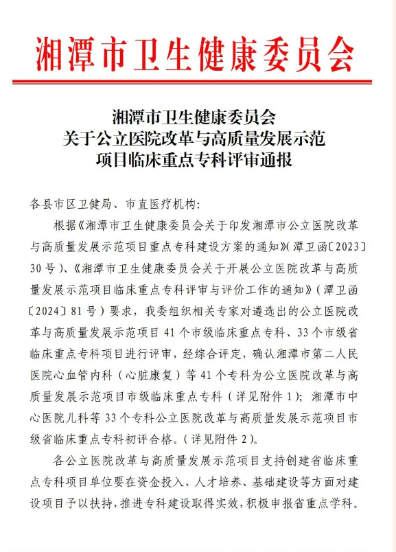 医院将以此次临床重点专科建设为契机,紧扣“抓重点、补短板、强弱项”这一工作思路,有效利用好临床重点专科这一平台,持续加强专科建设,充分发挥临床重点专科的示范引领作用,进一步提升医院诊疗技术水平和综合服务能力,为患者提供更加优质高效的医疗服务,以更加精湛的医术、更加优质的服务,为促进全市医疗卫生事业改革与高质量发展,加快推进“健康湘潭”战略做出新的更大贡献。(图/文 附属医院)