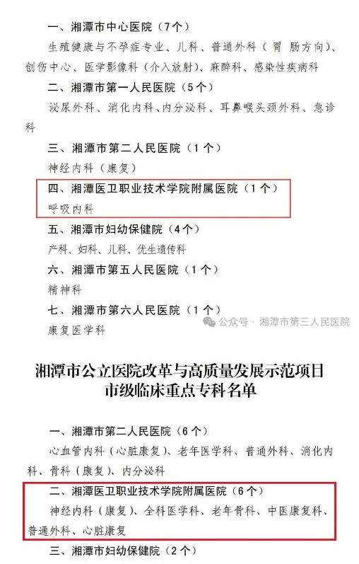 本网讯 近日,湘潭市卫生健康委员会正式公布《关于公立医院改革与高质量发展示范项目临床重点专科评审通报》,湘潭医卫职院附属医院呼吸内科顺利通过市级省临床重点专科项目评审,神经内科(康复)、全科医学科、老年骨科、中医康复科、普通外科、心脏康复顺利通过市级临床重点专科评审,这不仅标志着湘潭医卫职院附属医院专科建设水平和医疗服务能力迈上新台阶,更为医院高质量发展奠定了坚实基础。