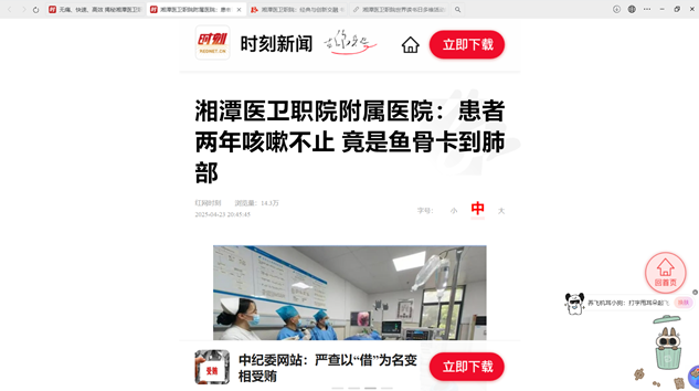 【红网】湘潭医卫职院附属医院:患者两年咳嗽不止 竟是鱼骨卡到肺部