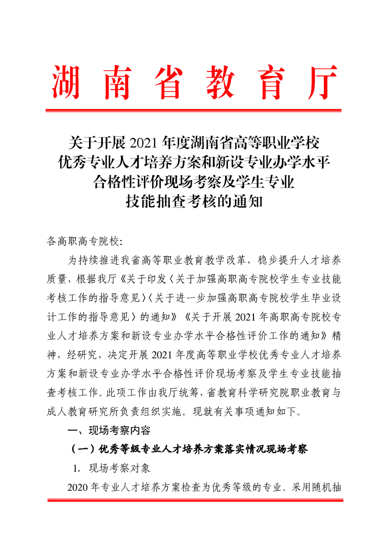 关于开展2021年度湖南省高等职业半岛平台优秀专业人才培养方案和新设专业办学水平合格性评价现场考察及学生专业技能抽查考核的通知