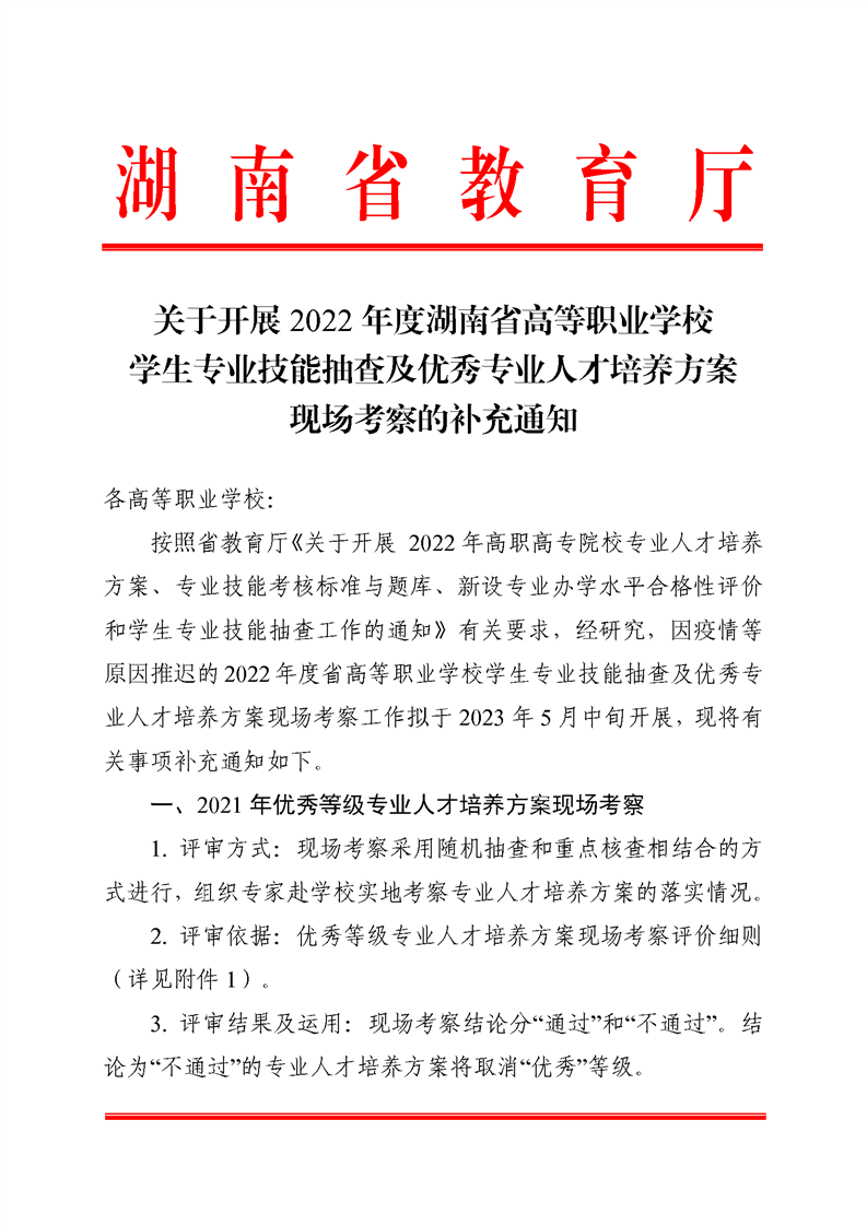 关于开展2022年度湖南省高等职业半岛平台学生专业技能抽查及优秀专业人才培养方案现场考察的补充通知