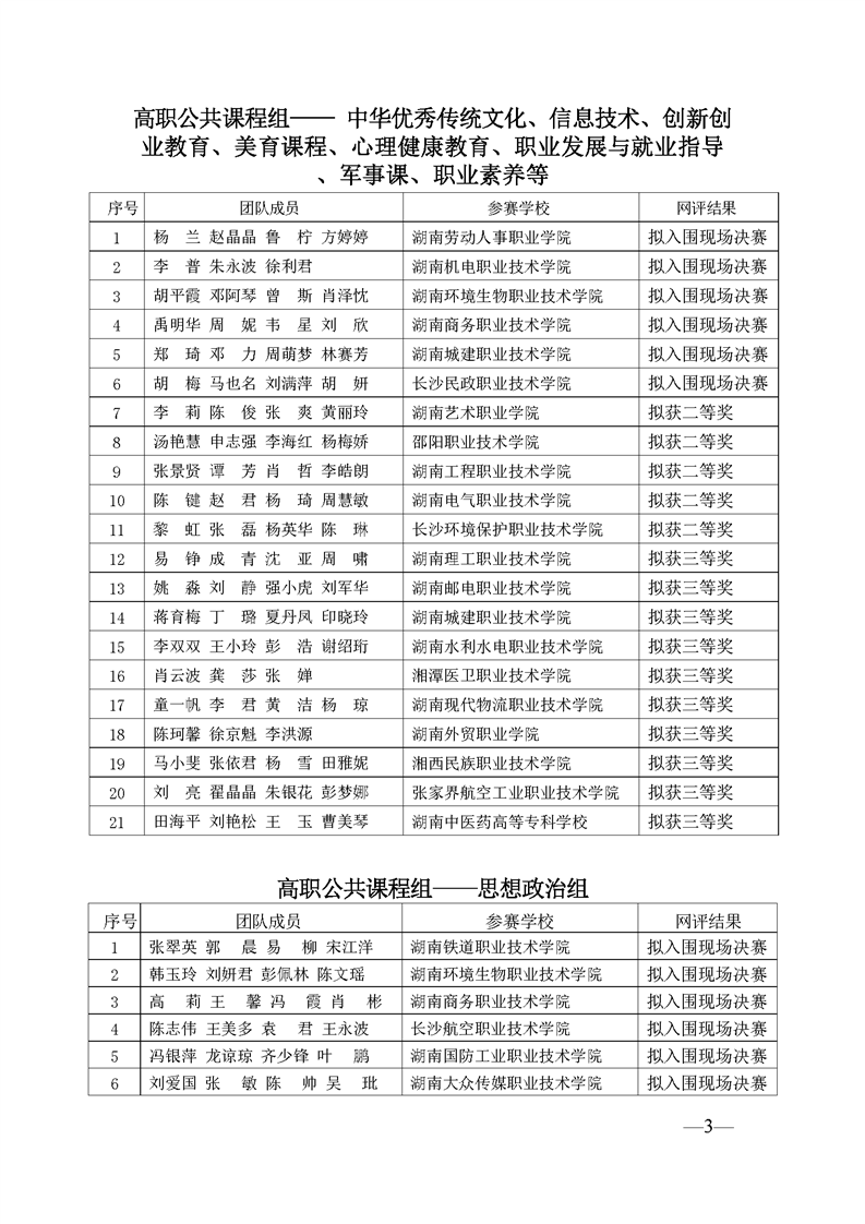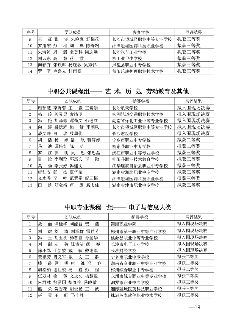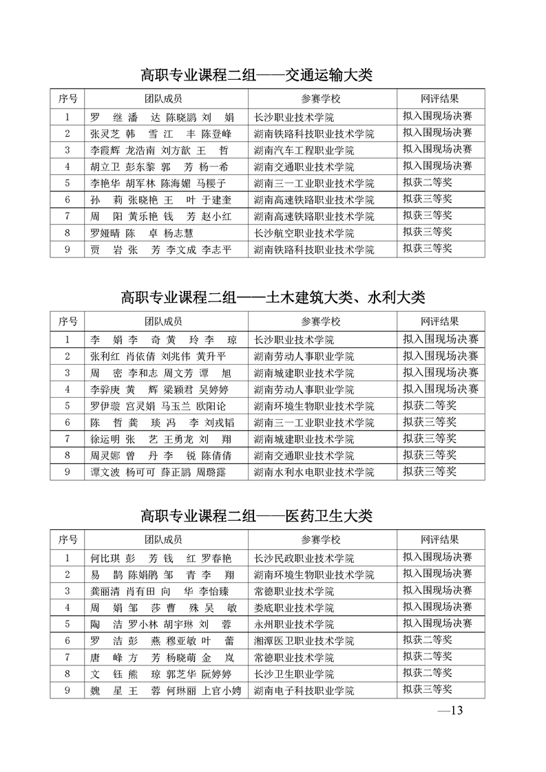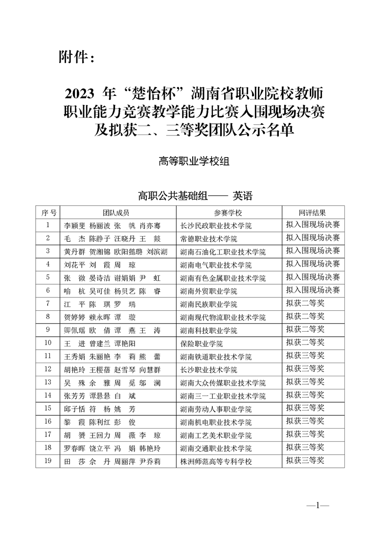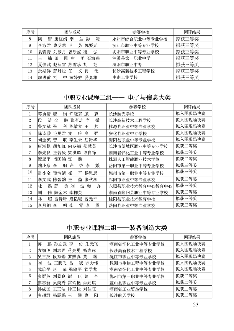 2023 年“楚怡杯”湖南省职业院校教师职业能力竞赛教学能力比赛入围现场决赛及拟获二、三等奖团队公示