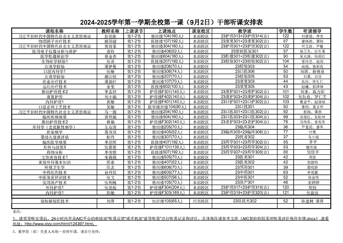 2024-2025学年第一学期全校第一课(9月2日)干部听课安排表