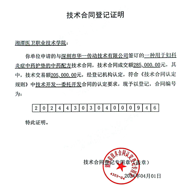 4月1日,从湘潭市科技局传来好消息,我校尹爱武教授申报的“一种用于妇科炎症中药护垫的中药配方”技术合同获得国家科技部认定。这份技术合同登记证明的落地,标志着我校科技成果转化取得新的较大突破。