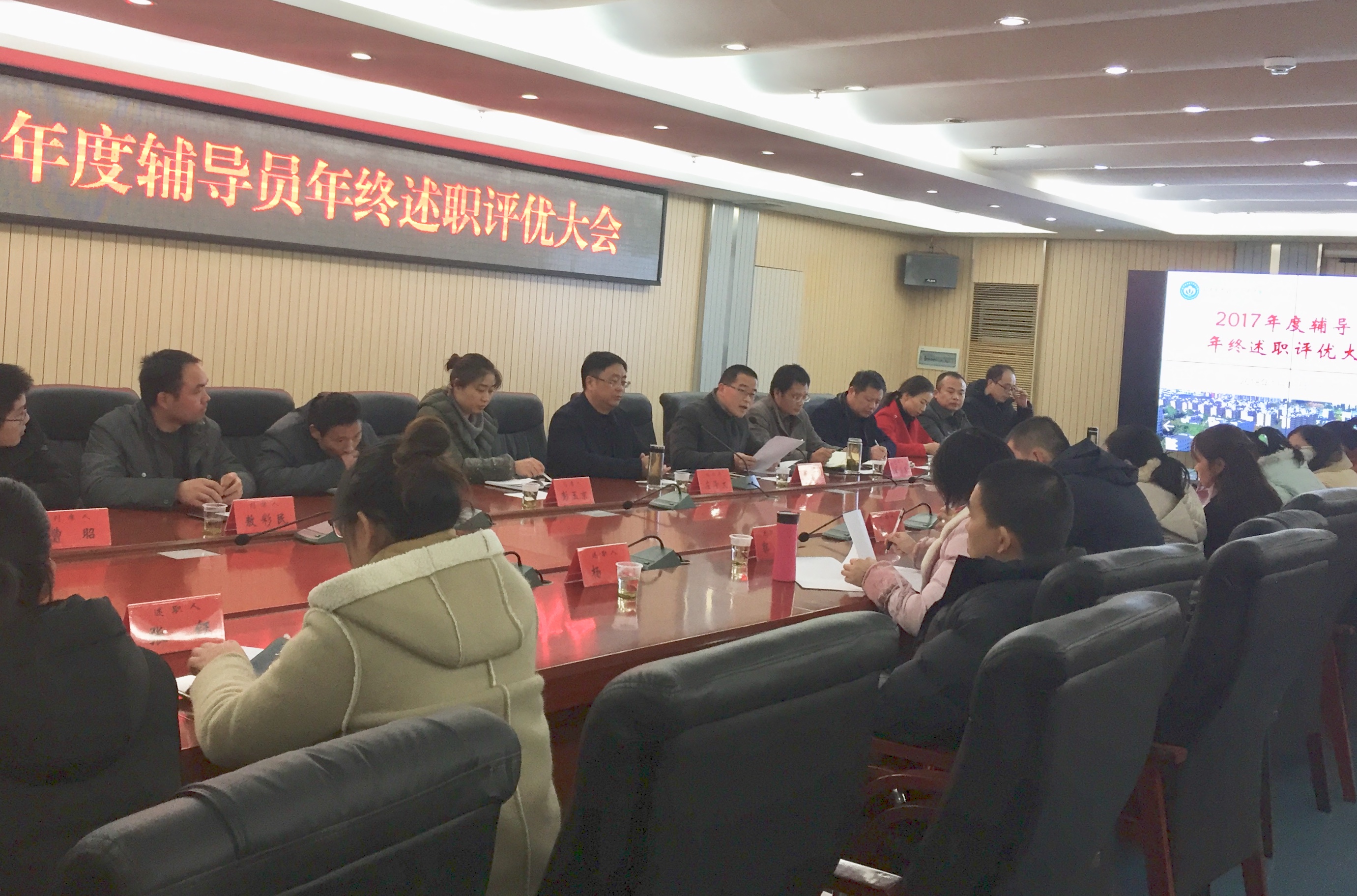 1月15日下午,我校2017年度辅导员年终述职评优大会在护理楼八楼会议室举行,述职会由学生工作处处长汪石果主持,校党委副书记左泽文出席并听取了辅导员一年来的工作汇报,学生工作处、团委负责人和各二级学院党总支书记、党总支副书记参加会议。