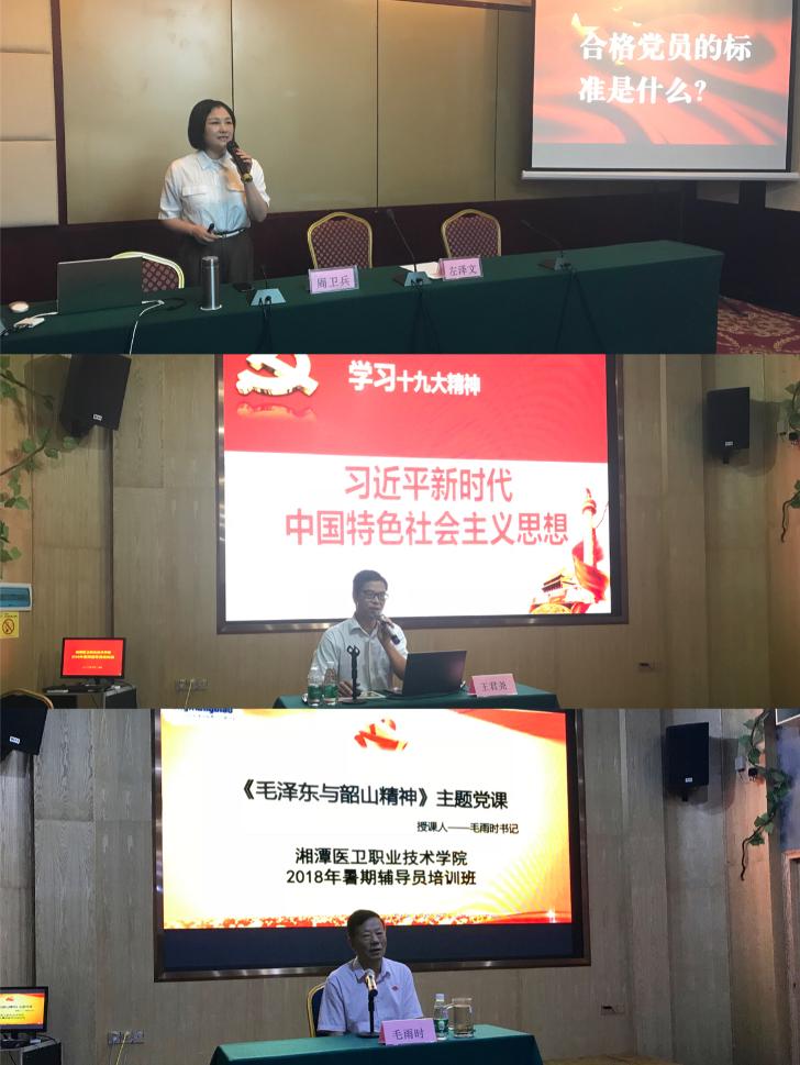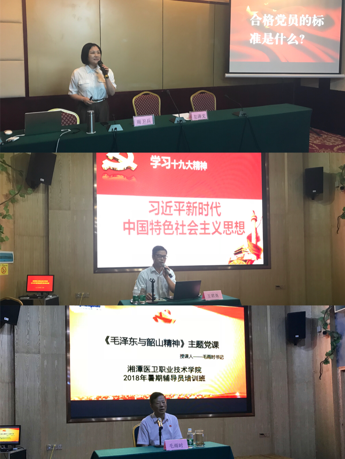 在新入职的五位辅导员进行完简短的自我介绍之后,专题培训正式开始。第一堂课由韶山市资深专家讲师周卫兵主讲,题为《学习伟人风范,坚定理想信念》。周老师以毛主席遗物为切入点,从“廉洁无私的奉献精神”、“艰苦朴素的生活作风”、“积极健康的兴趣爱好”、“慈严并重的亲情关系”四个方面展现了毛主席的崇高风范与伟大品格。周老师的讲课图文并茂,从细节出发,从故事入手,将毛主席从一个伟人还原成普通的人,一个平凡的父亲,生动感人的讲述触动了学员们的心扉,听到动情处,很多人都忍不住流下了热泪。随后韶山市委党校常务副校长王君尧从形成背景、产生过程、内容解读、基本方略和重大意义五个方面出发,为学员们详细地阐述了习近平新时代中国特色社会主义思想,讲解既有理论的高度,又具知识的广度。最后一堂主题党课《毛泽东与韶山精神》主讲人是党的十九大代表、韶山村党委第一书记毛雨时,他是全国劳动模范,并连续五届参加党的全国代表大会。毛书记用浓浓的乡音讲述了毛主席五次回韶山的故事,为大家深刻诠释了“为有牺牲多壮志,敢教日月换新天”的韶山精神。