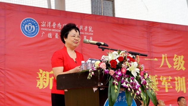 在庄严的升国旗仪式后,校长廖晓燕发表了讲话。她代表半岛平台全体师生向4000名新同学表示热烈的欢迎,她简要介绍了半岛平台的发展历史和近年来的办学成果后指出,近年来,半岛平台办学成果丰硕,教育教学质量稳步提升,办学条件不断改善,医卫特色日益彰显,社会影响力持续扩大,她希望同学们在大学三年做好“三件事”:第一,要做负责任的大学生。同学们背负着医学生誓词上所说的“健康所系、性命相托”的重任,要对病人负责、对自己负责、对社会负责。第二,要做懂礼仪的大学生。“人无礼则不立,事无礼则不成,国无礼则不宁”,同学们要从容得体、高雅不俗,展现大学生的良好形象,做文明人,办文明事。第三,要做精技能的大学生。同学们要以“工匠精神”追求极致和完美,在学习上精益求精,在技能上尽善尽美,成为行家里手。最后,她以李时珍尝遍百草而成《本草纲目》,屠呦呦一生致力研究青蒿素,终于成为第一位获得诺贝尔科学奖项的中国本土科学家的故事,勉励同学们要以铁杵成针的毅力、钉钉子的精神,持之以恒,修炼本领,提升技能,为祖国的医疗卫生事业贡献自己的智慧和力量。