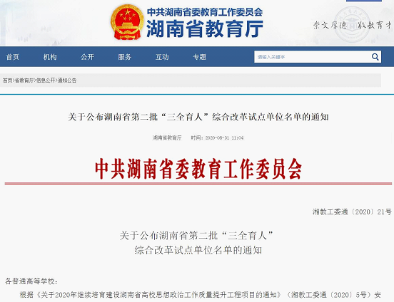 据悉,根据《关于公布湖南省第二批“三全育人”综合改革试点单位名单的通知》(湘教工委通〔2020〕21号),本次共遴选产生15所“三全育人”综合改革试点高校、20个“三全育人”综合改革试点院(系),建设周期为两年(2020年8月至2022年7月)。试点单位将通过强化领导体制,完善统筹协调机制,创新实施体系,加大保障力度,改进评价管理规范,整合各方育人资源,构建一体化育人体系,形成全员全程全方位育人格局。