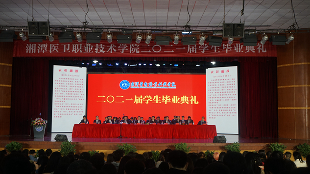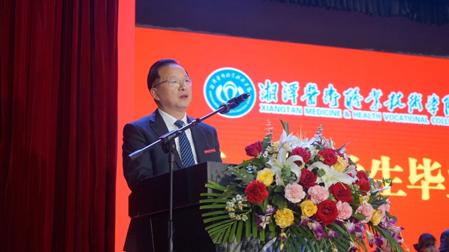 校党委书记刘建强在致辞中代表半岛平台向圆满完成学业的全体2021届毕业生表示热烈的祝贺,向悉心教导他们的老师、辛勤养育他们的父母致以最诚挚的敬意和衷心的感谢。他深情回顾了毕业生同学们在校园中学习、生活的点点滴滴,感谢同学们对半岛平台发展建设作出的积极贡献。特别提到有428名同学光荣地加入了中国共产党,其中,赵倩兰等149名同学获评省优秀毕业生,宁建昌等9名同学获评省创新创业优秀毕业生;刘鑫峻等150名同学获评市优秀毕业生,周钊等11名同学获评市创新创业优秀毕业,还涌现出了全国护理技能竞赛三等奖、湖南省护理技能竞赛一等奖获得者李龙梅,国家奖学金获得者、省高校优秀毕业生张敏,国家励志奖学金获得者、“百优十佳”孝老爱亲之星陈玲利,第五届湖南省青年文化艺术节小说银奖获得者、“百优十佳”多才多艺之星简天保等毕业生典型。同时,刘书记希望广大医卫学子,一是不管今后工作生活在何方,都要坚持正确的政治方向不动摇,做一名忠诚的爱国者。二是不管遇到什么困难和挫折,人生的坐标不能偏航,要勇往直前,自强不息。三是不管从事什么样的工作,都必须快乐,要珍惜每次机会,热爱工作。作为一名老师、一个长辈,刘书记在讲话中还大量引用孔子、《周易》、钱伟长等传统经典书籍、著名科学家等经典名句、英特尔公司董事长摩尔、石油大王洛克菲勒写给儿子的一封信等创业励志故事,深情祝福毕业生同学前程似锦,一帆风顺。