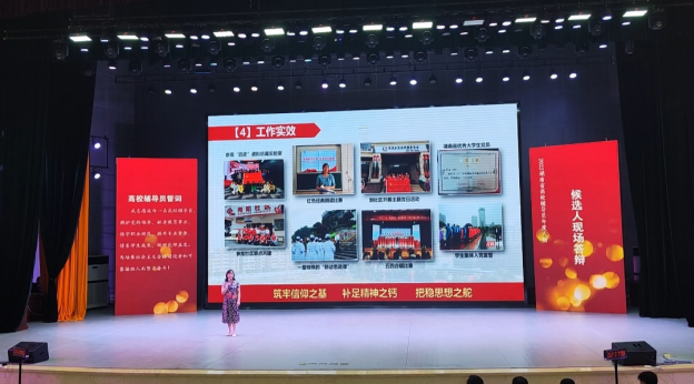 本次现场答辩活动紧张激烈、精彩纷呈。我校辅导员袁艾兰以《初心如磐担使命 躬身问道育新人》为题,分享了她始终秉持“围绕学生、关照学生、服务学生”的理念,依托领航-护航-助航-导航四大育人工程,结合学生基层党团组织和班集体各自育人特点,构建了“12345”党团班“三位一体”协同育人模式,总结出了“拧成一股绳,协同合作凝心聚力;下好一盘棋,躬身实践树立品牌;织密一张网,望闻问切助力成长”的工作方法,不断提升组织育人实效。